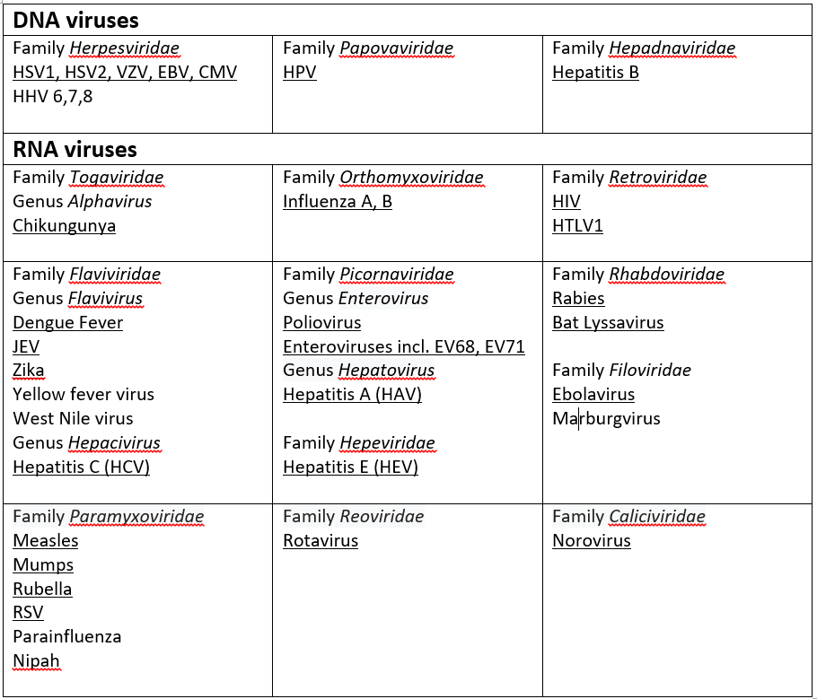 Particular attention required for those agents underlined. This is not an exhaustive listing but includes all viruses of current clinical relevance.