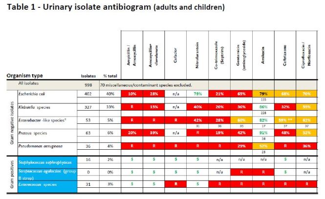 There is selection bias inherent in the samples included in hospital antibiograms and great care must be taken with its interpretation. Treatment guideline review and modification in the light of this antibiogram needs to take into account specific clinical data that assesses the response to treatment of both culture positive and negative infections across the different patient groups (paediatric, adult) and locations (intensive care, non intensive care, outpatient). Susceptibility rates at other institutions may differ significantly.